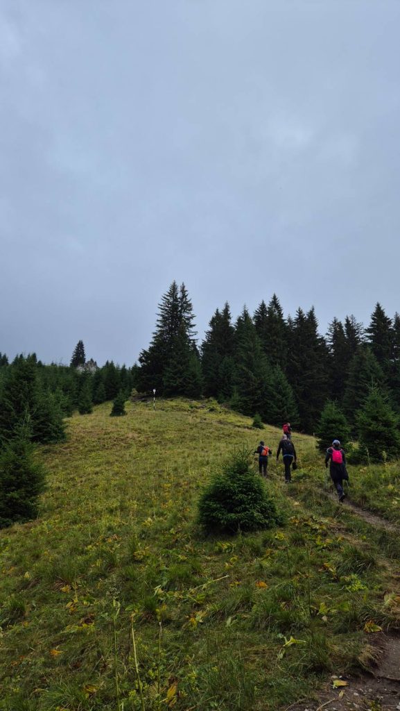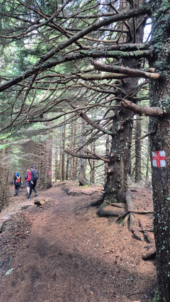 Traseul începe cu un urcuș abrupt, care trece pe lângă o cabină pentru aparatură seismologică. Intrăm pe sub crengile unor molizi bătrâni, parcă desprinși din Lord of the Rings, cum nu am mai văzut în munții noștri atât de aproape de potecă. După ce ocolim prin stânga Vârful Muntele Roșu (1765 m), ajungem La Răscruce, în culmea Gropșoarele-Zăganu.