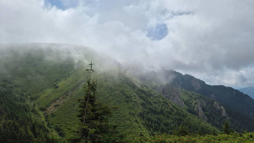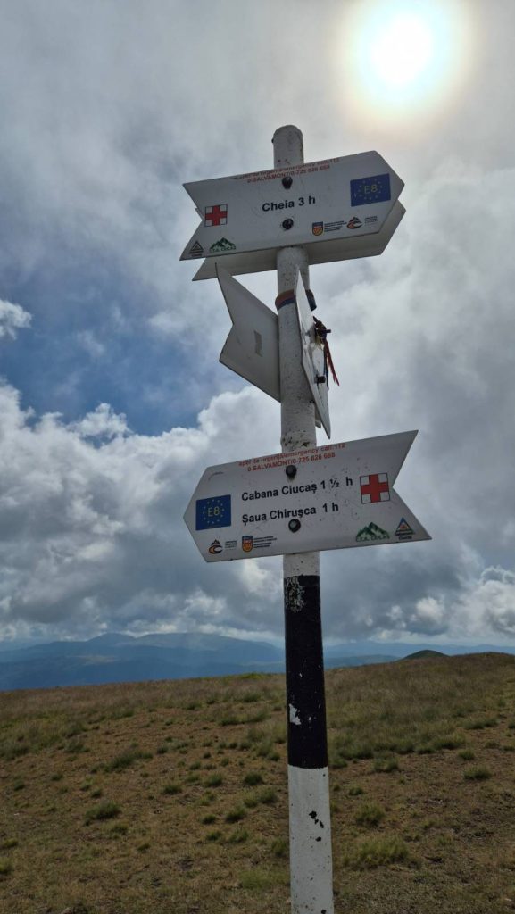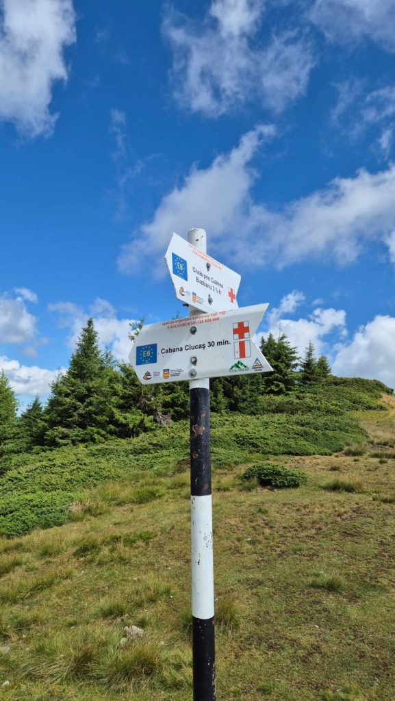 2) La Răscruce (1805 m) – Șaua Chirusca (1567 m) [cruce roșie] – Cabana Ciucaș (1595 m) [bandă roșie], 1h 30m