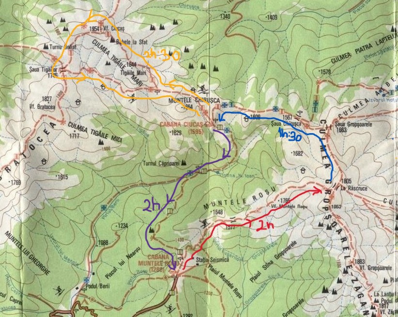 Cabana Muntele Roșu – La Răscruce – Cabana Ciucaș – Vârful Ciucaș – Șaua Tigăilor – Cabana Ciucaș – Cabana Muntele Roșu (~7-8 ore în total).